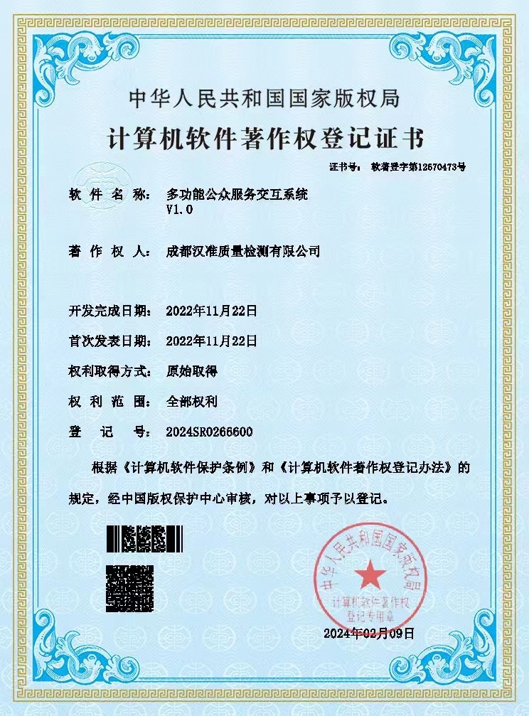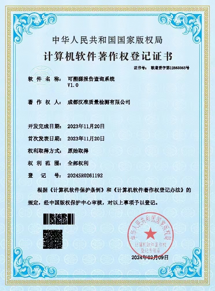 汉准质检申请的全流程化订单管理系统、可溯源报告查询系统、多功能公共服务交互系统已经取得软件著作权登记证书。